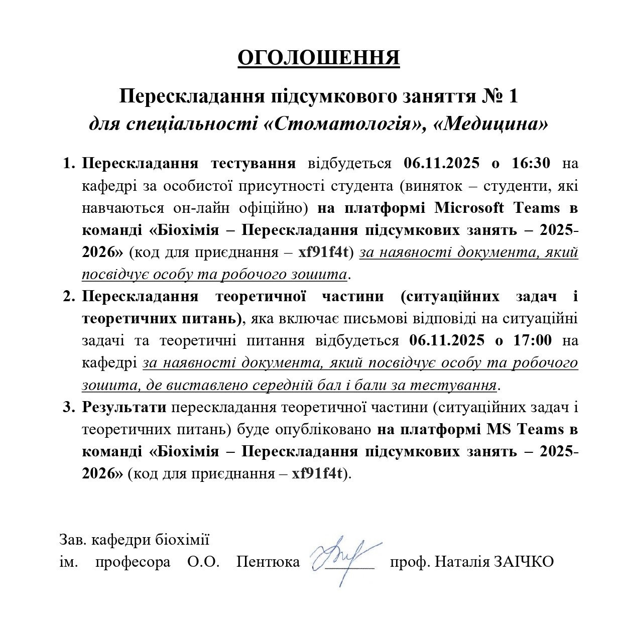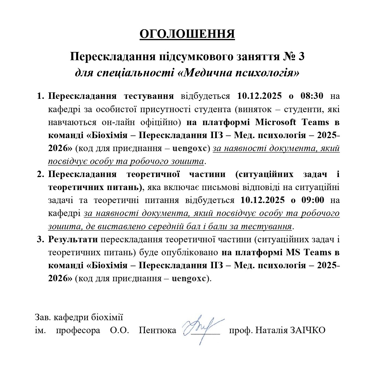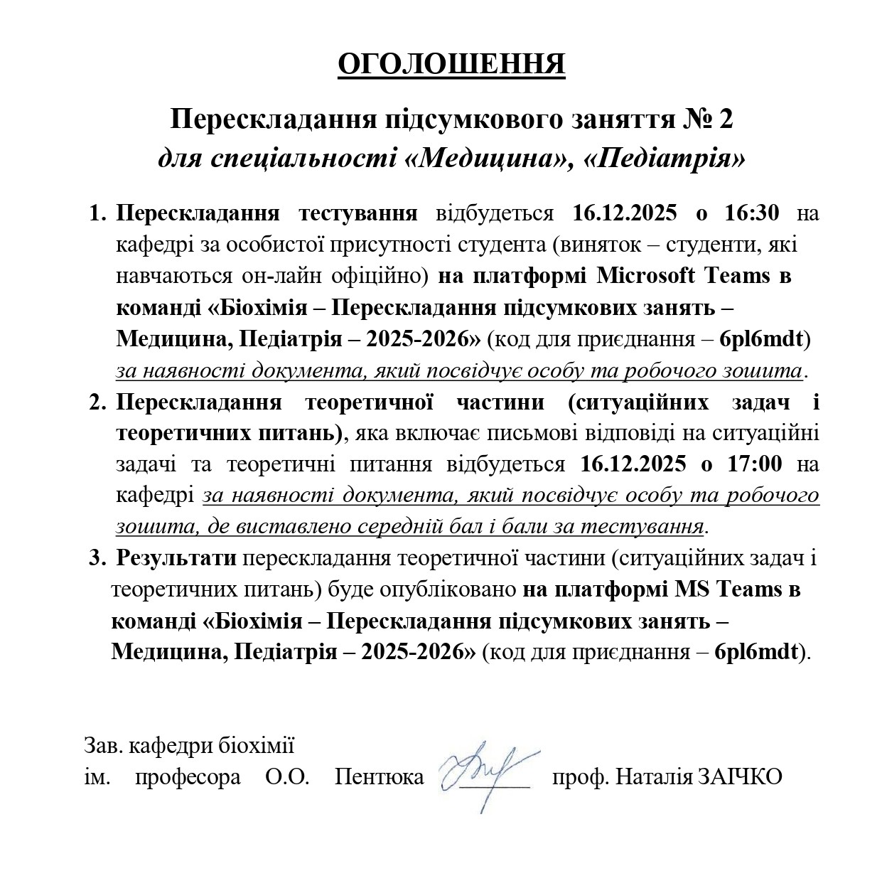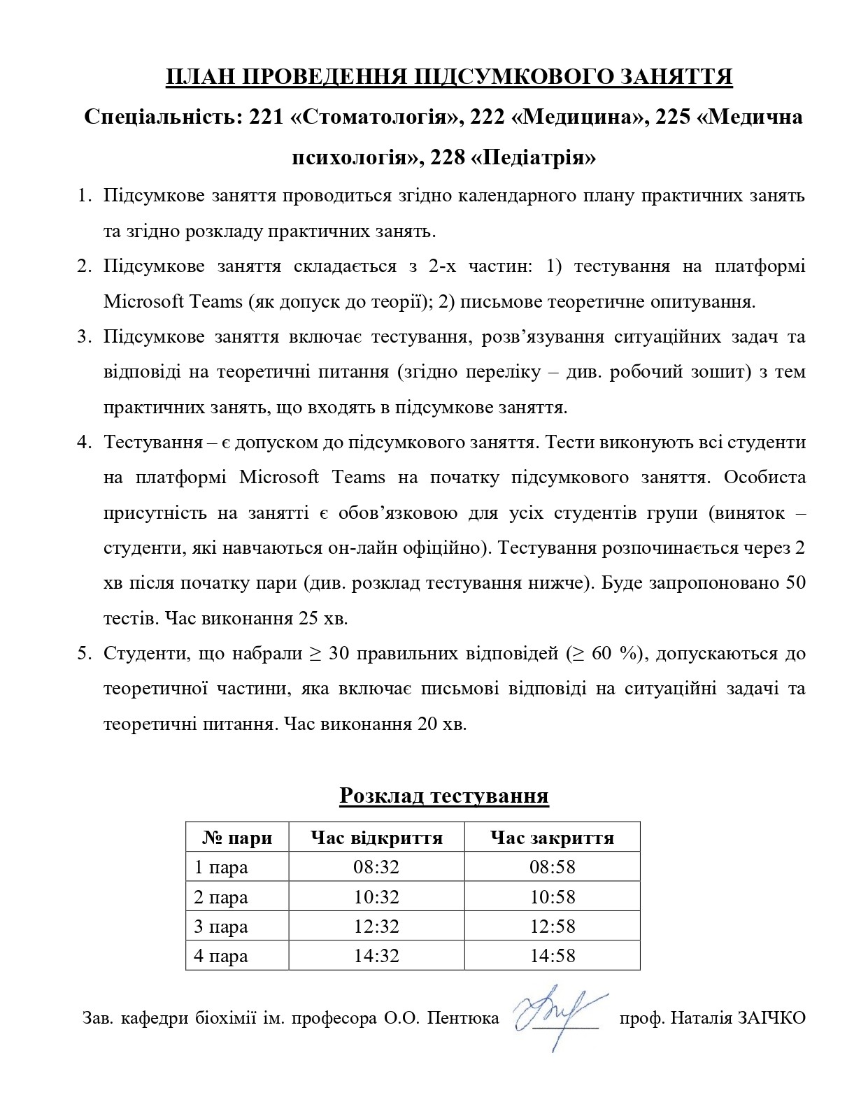 1. Відповідно до Наказу ВНМУ ім. М.І.Пирогова №157 від 11.03.2022, розпорядження ВНМУ ім. М.І. Пирогова №19 від 21.04.2022 перевідний підсумковий контроль (іспит) з Біологічної хімії за 2021-2022 н.р. переведено у форму диференційованого заліку для студентів всіх факультетів (спеціальності 222 Медицина, 228 Педіатрія, 226 Фармація, 225 Медична психологія).