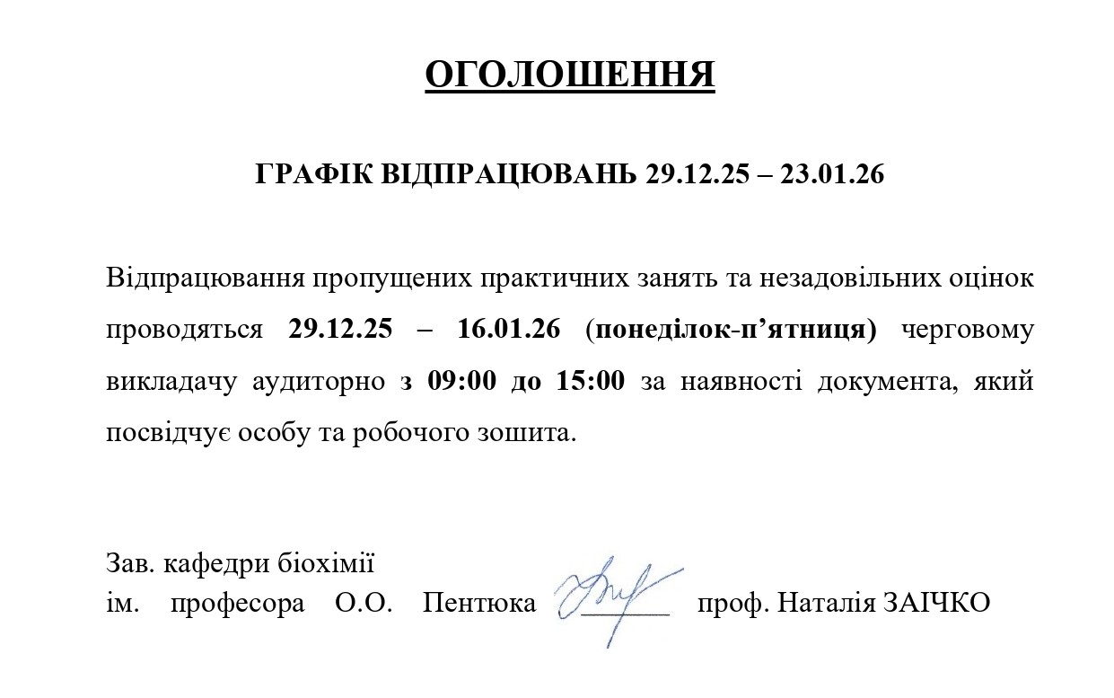 Зав. кафедри біологічної та загальної хімії                   проф. Наталія ЗАІЧКО