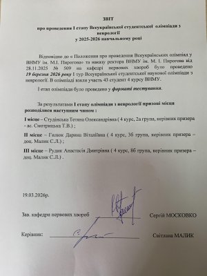 Наукові роботи кафедри нервових хвороб Вінницького національного медичного університету ім. М.І. Пирогова: «Клініко-епідеміологічна характеристика основних захворювань нервової системи в Подільському регіоні України», № держреєстрації 0196U004916 та «Невідкладна реканалізація в умовах різних моделей супровідної терапії та розширеної нейровізуалізації поряд з іншими факторами прийняття рішення про подальше лікування при гострому ішемічному інсульті» № держреєстрації 0123U104947, дата реєстрації: 05-12-2023.