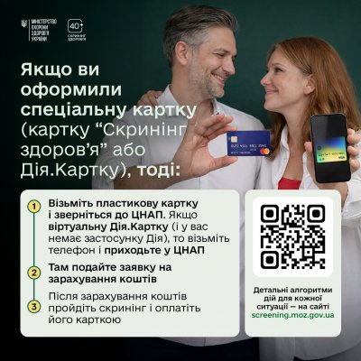 Щоб отримати державну підтримку на проходження скринінгу, необхідно оформити спеціальну картку одним із двох способів залежно від ваших технічних можливостей.