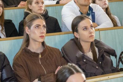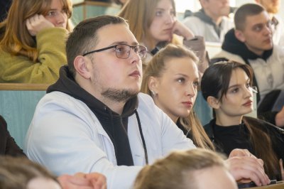 Останню лекцію середи, 25 березня, в аудиторії 5 на запрошення адміністрації університету студентам прочитав лейтенант поліції Вʼячеслав Білоус. Цього разу старший інспектор з особливих доручень відділу звʼязків з громадськістю Управління патрульної поліції у Вінницькій області розповідав майбутнім лікарям, як не стати жертвою вербування та примусу до протиправних дій. І слухали його дуже уважно.